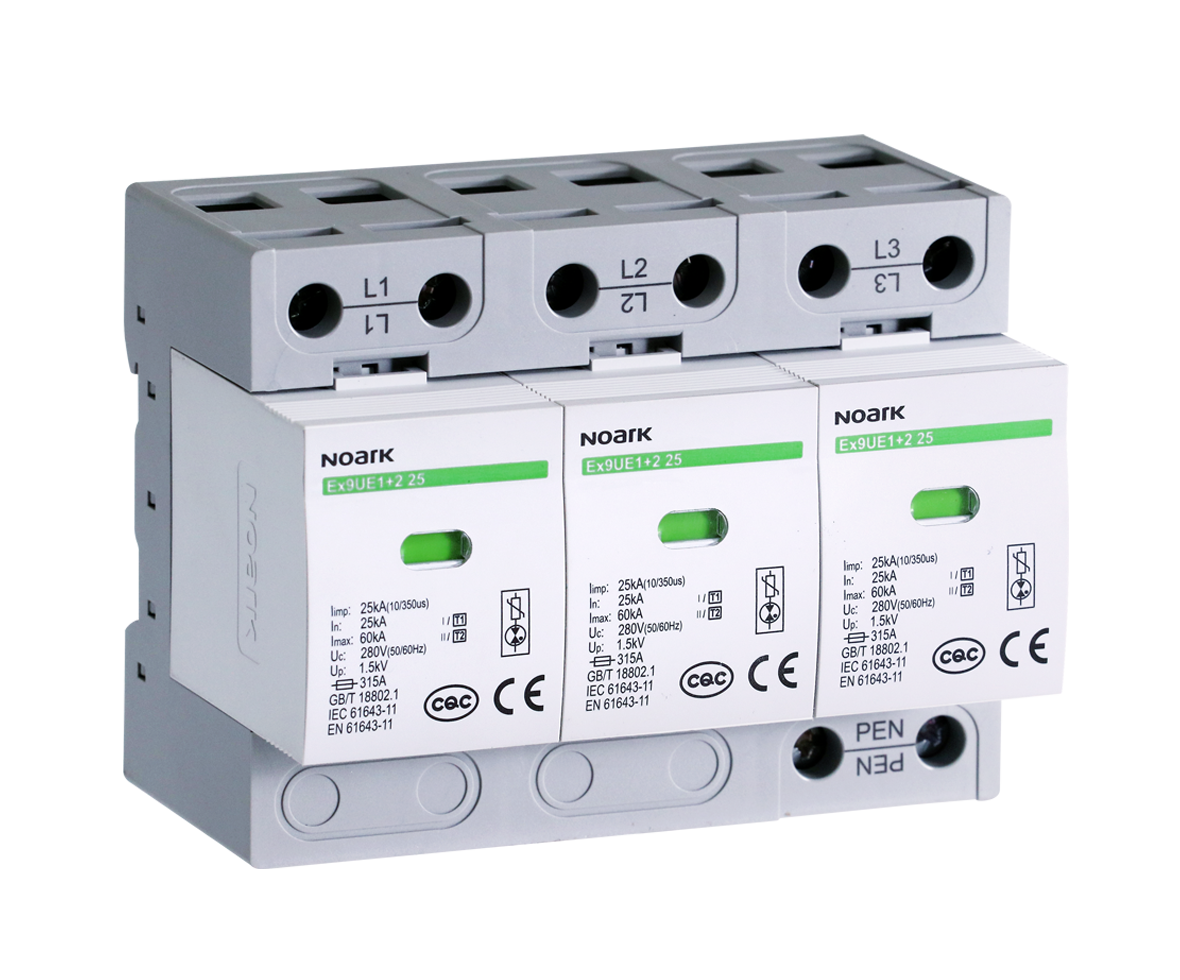 Ex9UE1+2 25电涌保护器适用于交流50/60Hz,额定电压为400V的三相配电和控制系统中,用于抑制瞬态过电压低于设备耐受冲击过电压,泄放电涌能量,主要应用于建筑低压配电系统的直击雷防护和主进线柜电涌防护。