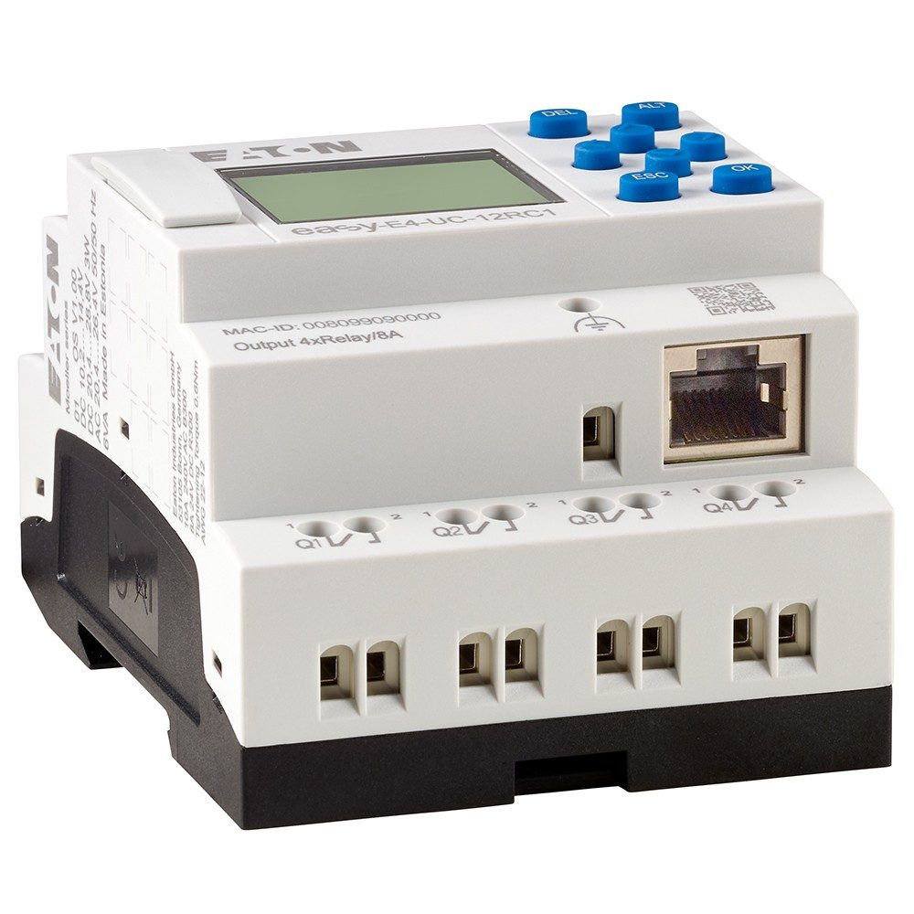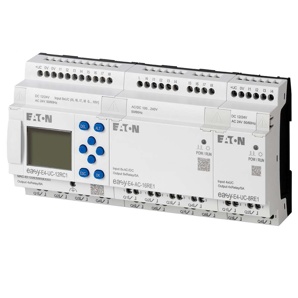easyE4 可编程继电器基本单元和输入/输出扩展模块提供直流、交流和 UC(通用)电压,使装置非常适合用于机器制造或建筑应用。通过多达 11 个扩展模块,可将基本单元扩展到多达 188 个输入/输出,所有扩展都可以根据要求进行混合及组合,得益于智能插入式技术,可以快速连接或更换扩展模块。