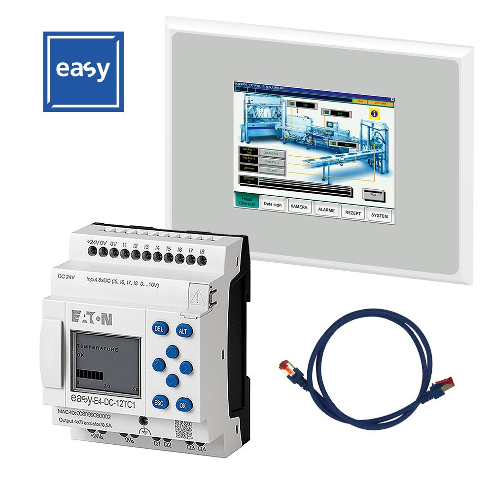 easyE4 可编程继电器提供多种可视化选项,满足个性化需求。方便的可视化方法,是将 easyE4 与 3.5 英寸触摸面板XV-102-A0-35TQRB-1E4 结合使用,Galileo 支持图形可视化,或者使用 easyE4 基本单元显示,来显示或更改文本和数据。得益于集成的网页服务器,还可通过智能手机或平板电脑等所有支持互联网的设备访问数据。